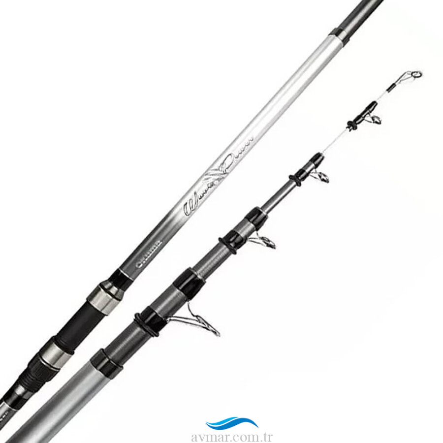 Okuma Wave Power Tele Surf kamış için 24T GT gövde yapısı, tuzlu suya dayanıklı derin pres halkalar, Okuma DPS boru makine takma yeri ve görsel beyaz uç kullanıldı.