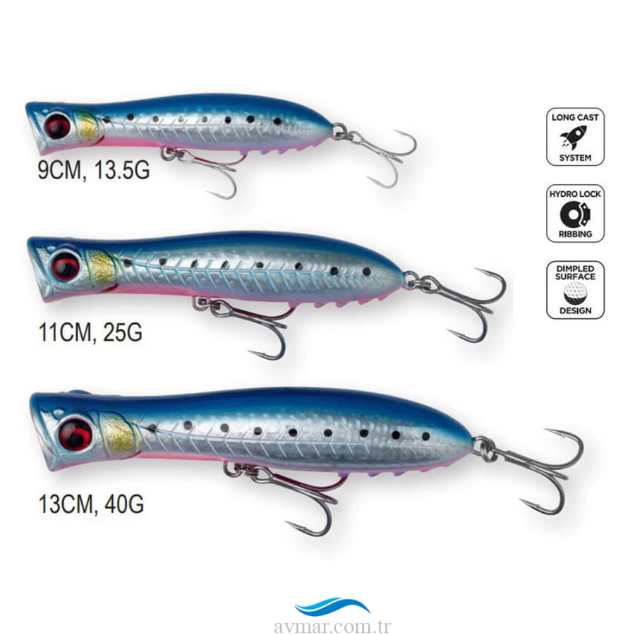 GRAVITY POPPER Kaya gibi sağlam yapı kalitesi, Thru Wire yapısı ve ultra uzun atış yapılabilen tasarımı ile Gravity Popper, canavar tuzlu su avcılığının ihtiyaçlarına cevap vermek için yapılmıştır. Yenilikçi bir Hydro Lock Ribbing sistemi, bedenin arka iğneye takılma olasılığını en aza indirirken aynı zamanda ekstra baloncuklar üretir. Köpürme alanının çukurlu yapısı, havayı hapsederek daha fazla baloncuk oluşmasına da yardımcı olur. Bu, aç avcıların dikkatini çekeceği kesin olan farklı bir frekans patlama sesi çıkarmasıyla sonuçlanır.